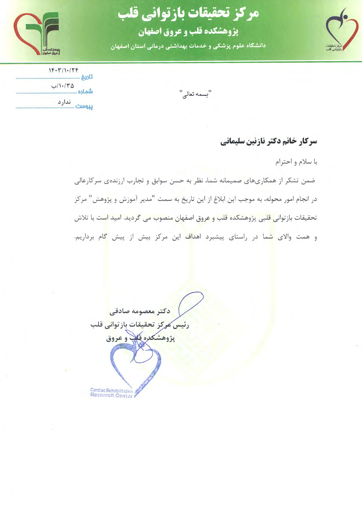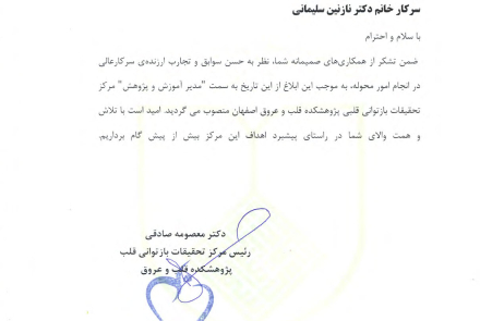 انتصاب خانم دکتر سلیمانی به سمت «مدیر آموزش و پژوهش» خانم دکتر معصومه صادقی رئیس مرکز تحقیقات بازتوانی قلب، طی حکمی خانم دکتر سلیمانی را به سمت «مدیر آموزش و پژوهش» منصوب نمودند.