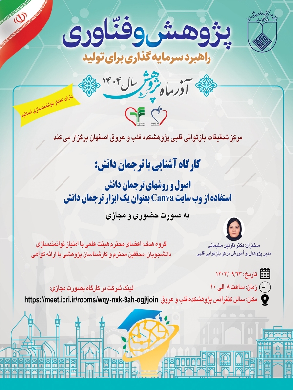 کارگاه جامع آموزشی ترجمان دانش آذر ماه پژوهش سال 1404لینک شرکت در کارگاه بصورت مجازی:https://meet.icri.ir/rooms/wqy-nxk-9ah-ogj/join